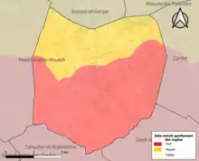 Le retrait-gonflement des sols argileux est susceptible d'engendrer des dommages importants aux bâtiments en cas d’alternance de périodes de sécheresse et de pluie. La totalité de la commune est en aléa moyen ou fort (67,5 % au niveau départemental et 48,5 % au niveau national). Sur les 612 bâtiments dénombrés sur la commune en 2019, 612 sont en aléa moyen ou fort, soit 100 %, à comparer aux 90 % au niveau départemental et 54 % au niveau national. Une cartographie de l'exposition du territoire national au retrait gonflement des sols argileux est disponible sur le site du BRGM[19],[Carte 2].