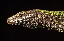 - L'écaille massétérique[Note 2] du Lézard des murailles est en général bien visible, assez grosse et ronde, entourée d'écailles temporales nombreuses et plus petites[20].