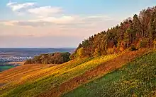 Löwenstein : Vue du chemin de terre sur la pente à l'est du cimetière au nord sur les vignobles et la lisière de la forêt au Wolfertsberg (à droite ; autre orthographe : "Wohlfahrtsberg") ; à gauche en arrière-plan une partie de la haute vallée de Sulm. Photo prise peu avant le coucher du soleil, un soir d'automne. La totalité de la zone visible appartient à la zone de protection du paysage "Oberes Sulmtal mit Randhöhen". Octobre 2020.