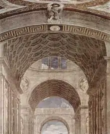 Le cadre monumental est dominé par l'imposante arcade en demi-cercle traditionnellement considérée comme une idée de Bramante mais que l'on tend aujourd'hui à attribuer entièrement à Raphaël lui-même[4].