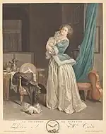 La gravure de Jean-Joseph-François Tassaert[22] est plus tardive ; postérieure à la Révolution, vers 1792-1793[alpha 8], elle se différencie de celle de Vidal par la coiffure, qui abandonne la mode 1760-70 de Fragonard pour une chevelure toujours tenue par un ruban noué en arrière, mais plus naturelle, relâchée librement sur le cou et les épaules et en boucles sur le front ; bien que le monogramme "A.C." figure toujours, la dédicace à Mlle Chéreau a été supprimée. Cependant, une version coloriée visible au musée des Beaux-Arts de San Francisco reprend en fac-similé la lettre de la gravure de Vidal[23].
