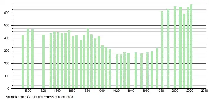 L'évolution du nombre d'habitants est connue à travers les recensements de la population effectués dans la commune depuis 1793. Pour les communes de moins de 10 000 habitants, une enquête de recensement portant sur toute la population est réalisée tous les cinq ans, les populations légales des années intermédiaires étant quant à elles estimées par interpolation ou extrapolation[21]. Pour la commune, le premier recensement exhaustif entrant dans le cadre du nouveau dispositif a été réalisé en 2007[22].