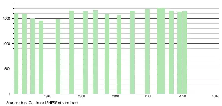 L'évolution du nombre d'habitants est connue à travers les recensements de la population effectués dans la commune depuis 1921. Pour les communes de moins de 10 000 habitants, une enquête de recensement portant sur toute la population est réalisée tous les cinq ans, les populations légales des années intermédiaires étant quant à elles estimées par interpolation ou extrapolation[32]. Pour la commune, le premier recensement exhaustif entrant dans le cadre du nouveau dispositif a été réalisé en 2008[33].
