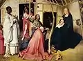 Peeter Scheyve et saint Pierre, représentés sur le panneau de gauche, apparaissent à la droite du Christ, une place d'honneur. Derrière eux, Joseph fait sécher des vêtements près d'un feu[2]. Bien qu'il s'agisse du seul triptyque dans lequel il représente un donateur, Bosch continue à respecter les codes de la représentation des donateurs. Au second plan de ce panneau, au milieu d'un champ, d'étranges créatures dansent (l'un, de trois quart dos, semble exhiber son sexe à l'attention d'une dame qui parait offusquée) et jouent d'un instrument de musique semblable à une cornemuse. Finalement, le panneau de droite, la donatrice agenouillée avec sainte Agnès derrière elle, debout, tenant une Bible. Derrière les deux femmes, un écu avec une fleur-de-lys a été peint. Un agneau, l'emblème de sainte Agnès, allongé sur le sol, se trouve au-dessus de la femme à genoux. À l'arrière plan, une femme tente d'échapper à un loup, alors qu'un homme - plus près — n'a pas pu échapper à un second loup et est en train d'être dévoré.