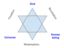 Les deux triangles conçus par Rosenzweig – le premier symbolisant « Dieu, le monde, l'homme, » ; le second, « la Création, la Révélation, la Rédemption » – se rejoignent et se recoupent à la manière d’une étoile. Le judaïsme qui se dessine ici se situe en dehors de l'histoire et du politique, il se transmet de génération en génération. Il s’agit de faire fructifier par l'étude et par la liturgie, mais non par l'engagement concret dans l’histoire.