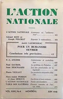En , la revue change à nouveau de nom pour L'Action nationale[2]. Esdras Minville, son nouveau directeur, entend poursuivre l'activité nationaliste de Lionel Groulx en faisant sienne sa devise : « Québec d'abord! ». Le premier numéro paraît à Montréal en . La ligne éditoriale se modifie progressivement à l'initiative d'une nouvelle génération de collaborateurs qui donnent une orientation plus laïque et souverainiste à la revue[6]. Issue d'abord du courant clérico-nationaliste, L'Action nationale se laïcise et se tourne progressivement vers le discours indépendantiste et se fait la porte-parole des principaux courants d'inspiration nationaliste lors de la Révolution tranquille et au moment des premiers succès du Parti québécois[7]. L'évolution de la revue est marquée par le passage - significatif dans l'histoire du Québec - d'un nationalisme canadien-français à un nationalisme québécois (années 1960)[6].