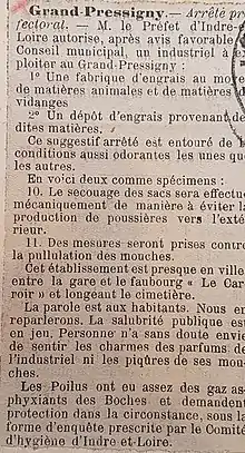 Au début du conflit, le Journal d’Indre-et-Loire commentait l’autorisation de l’usine en déclarant que nul n’est certainement désireux d’inhaler les odeurs de l’usine, ni d’apprécier les points de suture de ses mouches. Les Poilus [soldats de la Première Guerre mondiale] ont subi suffisamment de gaz asphyxiants allemands et exigent une protection.