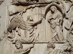 Le groupe est composé de deux sculptures indépendantes en marbre de Carrare[1] l'une représentant la vierge Marie annoncée, surprise dans sa lecture par la visite de l'archange Gabriel en vol, descendant du ciel, lui annonçant qu'elle enfantera du fils de Dieu et qui constitue l'autre sculpture. L'Ange (d'une hauteur de 185 cm)[2] dont la géométrie trace une diagonale descendant d'en haut à droite vers le bas à gauche est enveloppé d'un tissu au mouvement tourbillonnant décrivant une importante spirale particulièrement remarquable esthétiquement et techniquement[2]. L'archange possédait autrefois un lys dans la main droite qui est aujourd'hui brisé ainsi que le bout de son index[1]. L'expressivité de cette sculpture est particulièrement forte, tant dans le mouvement général que dans le visage de l'ange où se mêlent douceur et rictus quasi-sardonique. La Vierge annoncée (d'une hauteur de 210 cm)[2] est, elle, prise dans la stupeur, figée dans un mouvement où, lisant, elle se lève brusquement de sa chaise, qui est prête à tomber retenue par sa seule main, et se couvre de son manteau.