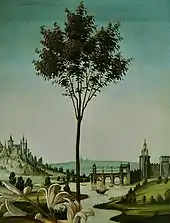 Le paysage que l’on aperçoit par la fenêtre, s’étendant très loin et mettant en place un paysage idéalisé, représente le Paradis perdu, que le Christ va racheter. On voit un tout jeune chêne, arbre sacré chez les Grecs et chez les Romains. Il symbolise l’infini temporel, tandis que la taille du paysage représente l’infini spatial.