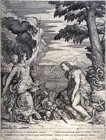 La composition fait écho à une autre peinture commencée par Titien pour Alfonso d'Este, duc de Ferrare (1486-1534), et laissée inachevée à la mort du duc. Elle a été vue dans l'atelier de Titien en 1568 par Giorgio Vasari, mais était encore incomplètement terminée. Elle représentait un nu masculin s'inclinant devant Minerve et une autre femme avec une branche de laurier représentant la Paix, avec Amphitrite dans un char en mer. Elle a été modifiée et envoyée à l'empereur romain germanique Maximilien II avant novembre 1568, pour montrer une figure représentant le Saint-Empire romain germanique défendant la Religion représentée par une allégorie[1]. Elle a été gravée par Giulio Fontana (es) c.1568, mais la peinture à l'huile d'origine est maintenant perdue[5].