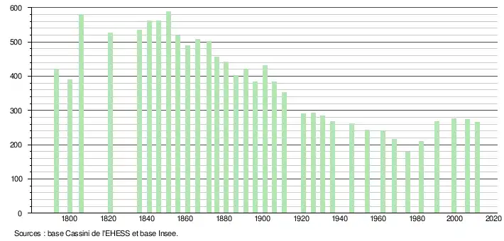 - Dans le tableau des recensements et le graphique, par convention dans Wikipédia, le principe a été retenu, pour les populations légales postérieures à 1999 de n’afficher dans le tableau des recensements et le graphique que les populations correspondant à l'année 2006, première population légale publiée calculée conformément aux concepts définis dans le décret no 2003-485 du 5 juin 2003, et les années correspondant à une enquête exhaustive de recensement pour les communes de moins de 10 000 habitants, ainsi que la dernière population légale publiée par l’Insee.