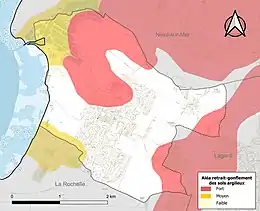 Le retrait-gonflement des sols argileux est susceptible d'engendrer des dommages importants aux bâtiments en cas d’alternance de périodes de sécheresse et de pluie. 39,8 % de la superficie communale est en aléa moyen ou fort (54,2 % au niveau départemental et 48,5 % au niveau national). Sur les 1 279 bâtiments dénombrés sur la commune en 2019, 199 sont en aléa moyen ou fort, soit 16 %, à comparer aux 57 % au niveau départemental et 54 % au niveau national. Une cartographie de l'exposition du territoire national au retrait gonflement des sols argileux est disponible sur le site du BRGM[24],[Carte 2].