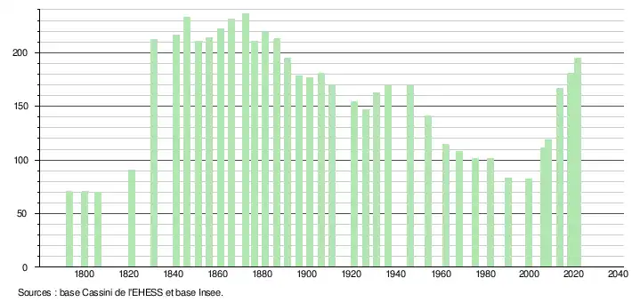 L'évolution du nombre d'habitants est connue à travers les recensements de la population effectués dans la commune depuis 1793. Pour les communes de moins de 10 000 habitants, une enquête de recensement portant sur toute la population est réalisée tous les cinq ans, les populations légales des années intermédiaires étant quant à elles estimées par interpolation ou extrapolation[28]. Pour la commune, le premier recensement exhaustif entrant dans le cadre du nouveau dispositif a été réalisé en 2008[29].