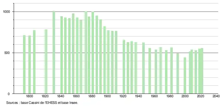 | L'évolution du nombre d'habitants est connue à travers les recensements de la population effectués dans la commune depuis 1793. Pour les communes de moins de 10 000 habitants, une enquête de recensement portant sur toute la population est réalisée tous les cinq ans, les populations légales des années intermédiaires étant quant à elles estimées par interpolation ou extrapolation[42]. Pour la commune, le premier recensement exhaustif entrant dans le cadre du nouveau dispositif a été réalisé en 2008[43]. En 2021, la commune comptait 556 habitants[Note 4], en augmentation de 4,12 % par rapport à 2015 (Gers : +0,79 %, France hors Mayotte : +1,84 %). |