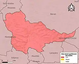 Le retrait-gonflement des sols argileux est susceptible d'engendrer des dommages importants aux bâtiments en cas d’alternance de périodes de sécheresse et de pluie. La totalité de la commune est en aléa moyen ou fort (94,5 % au niveau départemental et 48,5 % au niveau national). Sur les 289 bâtiments dénombrés sur la commune en 2019, 289 sont en aléa moyen ou fort, soit 100 %, à comparer aux 93 % au niveau départemental et 54 % au niveau national. Une cartographie de l'exposition du territoire national au retrait gonflement des sols argileux est disponible sur le site du BRGM[24],[Carte 3].