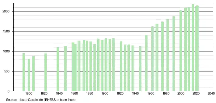 L'évolution du nombre d'habitants est connue à travers les recensements de la population effectués dans la commune depuis 1793. Pour les communes de moins de 10 000 habitants, une enquête de recensement portant sur toute la population est réalisée tous les cinq ans, les populations légales des années intermédiaires étant quant à elles estimées par interpolation ou extrapolation[26]. Pour la commune, le premier recensement exhaustif entrant dans le cadre du nouveau dispositif a été réalisé en 2005[27].