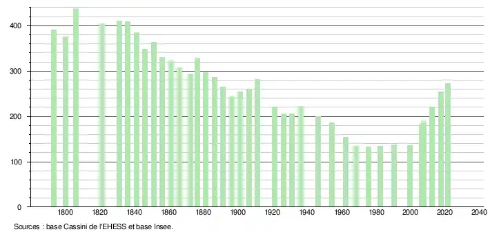 L'évolution du nombre d'habitants est connue à travers les recensements de la population effectués dans la commune depuis 1793. Pour les communes de moins de 10 000 habitants, une enquête de recensement portant sur toute la population est réalisée tous les cinq ans, les populations légales des années intermédiaires étant quant à elles estimées par interpolation ou extrapolation[28]. Pour la commune, le premier recensement exhaustif entrant dans le cadre du nouveau dispositif a été réalisé en 2007[29].