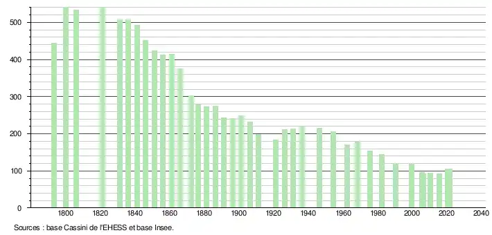 L'évolution du nombre d'habitants est connue à travers les recensements de la population effectués dans la commune depuis 1793. Pour les communes de moins de 10 000 habitants, une enquête de recensement portant sur toute la population est réalisée tous les cinq ans, les populations légales des années intermédiaires étant quant à elles estimées par interpolation ou extrapolation[27]. Pour la commune, le premier recensement exhaustif entrant dans le cadre du nouveau dispositif a été réalisé en 2005[28].