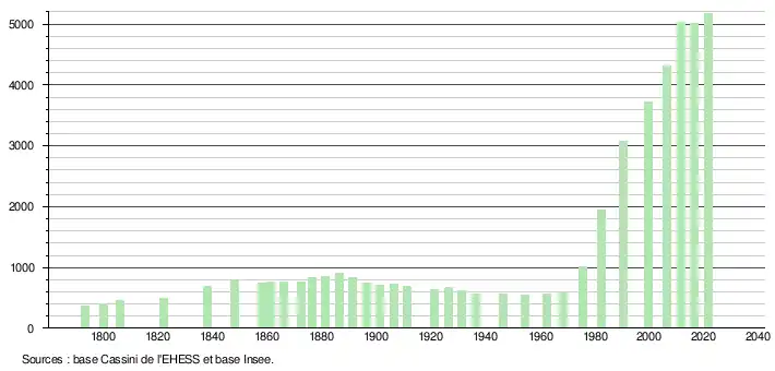 L'évolution du nombre d'habitants est connue à travers les recensements de la population effectués dans la commune depuis 1793. Pour les communes de moins de 10 000 habitants, une enquête de recensement portant sur toute la population est réalisée tous les cinq ans, les populations légales des années intermédiaires étant quant à elles estimées par interpolation ou extrapolation[23]. Pour la commune, le premier recensement exhaustif entrant dans le cadre du nouveau dispositif a été réalisé en 2006[24].