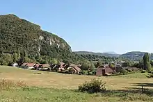 Vue de La Balme-de-Sillingy depuis le hameau de la Bâtie. Au premier plan, le plan d'eau. | |||||