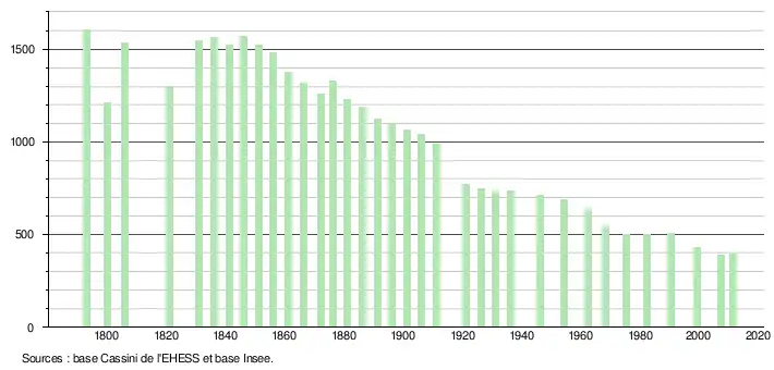 - Dans le tableau des recensements et le graphique, par convention dans Wikipédia, le principe a été retenu, pour les populations légales postérieures à 1999 de n’afficher dans le tableau des recensements et le graphique que les populations correspondant à l'année 2006, première population légale publiée calculée conformément aux concepts définis dans le décret no 2003-485 du 5 juin 2003, et les années correspondant à une enquête exhaustive de recensement pour les communes de moins de 10 000 habitants, ainsi que la dernière population légale publiée par l’Insee.