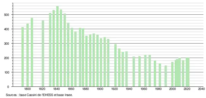 L'évolution du nombre d'habitants est connue à travers les recensements de la population effectués dans la commune depuis 1793. Pour les communes de moins de 10 000 habitants, une enquête de recensement portant sur toute la population est réalisée tous les cinq ans, les populations légales des années intermédiaires étant quant à elles estimées par interpolation ou extrapolation[46]. Pour la commune, le premier recensement exhaustif entrant dans le cadre du nouveau dispositif a été réalisé en 2004[47].