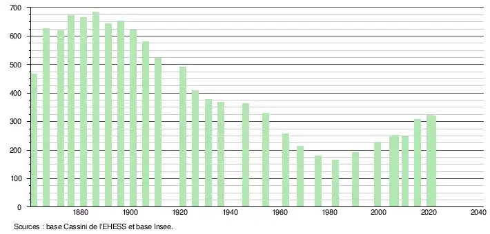 L'évolution du nombre d'habitants est connue à travers les recensements de la population effectués dans la commune depuis 1861. Pour les communes de moins de 10 000 habitants, une enquête de recensement portant sur toute la population est réalisée tous les cinq ans, les populations légales des années intermédiaires étant quant à elles estimées par interpolation ou extrapolation[15]. Pour la commune, le premier recensement exhaustif entrant dans le cadre du nouveau dispositif a été réalisé en 2005[16].