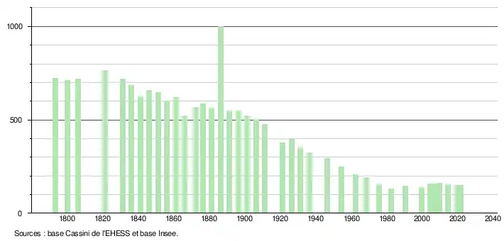 L'évolution du nombre d'habitants est connue à travers les recensements de la population effectués dans la commune depuis 1793. Pour les communes de moins de 10 000 habitants, une enquête de recensement portant sur toute la population est réalisée tous les cinq ans, les populations légales des années intermédiaires étant quant à elles estimées par interpolation ou extrapolation[37]. Pour la commune, le premier recensement exhaustif entrant dans le cadre du nouveau dispositif a été réalisé en 2004[38].