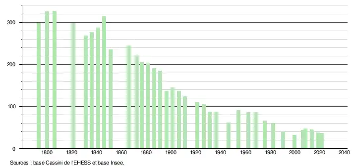 L'évolution du nombre d'habitants est connue à travers les recensements de la population effectués dans la commune depuis 1793. Pour les communes de moins de 10 000 habitants, une enquête de recensement portant sur toute la population est réalisée tous les cinq ans, les populations légales des années intermédiaires étant quant à elles estimées par interpolation ou extrapolation[19]. Pour la commune, le premier recensement exhaustif entrant dans le cadre du nouveau dispositif a été réalisé en 2008[20].