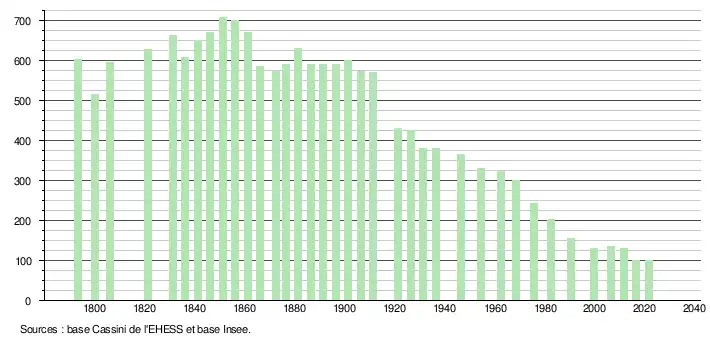L'évolution du nombre d'habitants est connue à travers les recensements de la population effectués dans la commune depuis 1793. Pour les communes de moins de 10 000 habitants, une enquête de recensement portant sur toute la population est réalisée tous les cinq ans, les populations légales des années intermédiaires étant quant à elles estimées par interpolation ou extrapolation[25]. Pour la commune, le premier recensement exhaustif entrant dans le cadre du nouveau dispositif a été réalisé en 2006[26].