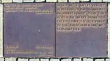 Plusieurs années après la construction de la structure principale du mémorial, une plaque de bronze a été incrustée dans les pavés à quelques mètres de là[6]. Gravée d'une citation de la pièce Almansor (1820) de l'auteur juif allemand Heinrich Heine, elle contient le message prémonitoire suivant :
