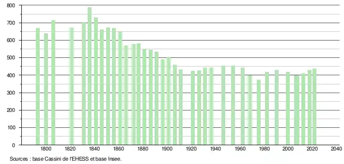 L'évolution du nombre d'habitants est connue à travers les recensements de la population effectués dans la commune depuis 1793. Pour les communes de moins de 10 000 habitants, une enquête de recensement portant sur toute la population est réalisée tous les cinq ans, les populations légales des années intermédiaires étant quant à elles estimées par interpolation ou extrapolation[29]. Pour la commune, le premier recensement exhaustif entrant dans le cadre du nouveau dispositif a été réalisé en 2007[30].