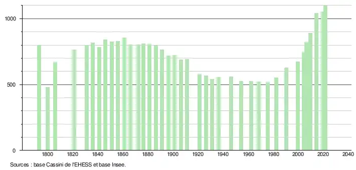 Le XXe siècle avec la deuxième révolution agricole contemporaine marquée par la motorisation, la mécanisation, la chimie et la sélection scientifique a entraîné l'effondrement spectaculaire de la main d'œuvre agricole et du nombre des exploitations agricoles de la commune, favorisant le déclin de la population des villages. Dans le même temps la construction de lotissements nouveaux a favorisé le grossissement de la population du bourg. En 1857, le bourg représentait moins d'un tiers de la population communale (300 habitants sur 830), aujourd'hui il groupe plus de la majorité de la population.