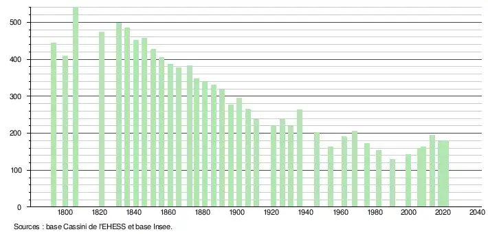 L'évolution du nombre d'habitants est connue à travers les recensements de la population effectués dans la commune depuis 1793. Pour les communes de moins de 10 000 habitants, une enquête de recensement portant sur toute la population est réalisée tous les cinq ans, les populations légales des années intermédiaires étant quant à elles estimées par interpolation ou extrapolation[20]. Pour la commune, le premier recensement exhaustif entrant dans le cadre du nouveau dispositif a été réalisé en 2008[21].