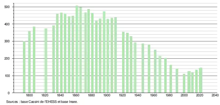 L'évolution du nombre d'habitants est connue à travers les recensements de la population effectués dans la commune depuis 1793. Pour les communes de moins de 10 000 habitants, une enquête de recensement portant sur toute la population est réalisée tous les cinq ans, les populations légales des années intermédiaires étant quant à elles estimées par interpolation ou extrapolation[17]. Pour la commune, le premier recensement exhaustif entrant dans le cadre du nouveau dispositif a été réalisé en 2005[18].
