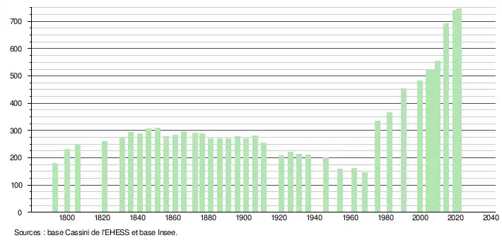 L'évolution du nombre d'habitants est connue à travers les recensements de la population effectués dans la commune depuis 1793. Pour les communes de moins de 10 000 habitants, une enquête de recensement portant sur toute la population est réalisée tous les cinq ans, les populations légales des années intermédiaires étant quant à elles estimées par interpolation ou extrapolation[23]. Pour la commune, le premier recensement exhaustif entrant dans le cadre du nouveau dispositif a été réalisé en 2004[24].