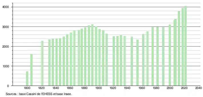 L'évolution du nombre d'habitants est connue à travers les recensements de la population effectués dans la commune depuis 1800. Pour les communes de moins de 10 000 habitants, une enquête de recensement portant sur toute la population est réalisée tous les cinq ans, les populations légales des années intermédiaires étant quant à elles estimées par interpolation ou extrapolation[32]. Pour la commune, le premier recensement exhaustif entrant dans le cadre du nouveau dispositif a été réalisé en 2007[33].
