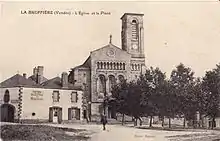 - L'actuelle église Sainte-Radegonde fut construite en 27 mois et achevée en avril 1891 sous la conduite de l'architecte nantais René Michel Menard (1843-1895). Elle fut en grande partie financée et érigée par la cardinal Richard, de Paris, possédant le château de l'Echasserie. Elle appartient au style néo-roman mais l'intérieur de l'édifice pencherait plus vers le roman-byzantin par le choix des matériaux et de leur agencement. Les voûtes du chœur sont particulièrement remarquables[39].