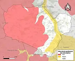 Les mouvements de terrains susceptibles de se produire sur la commune sont des affaissements et effondrements liés aux cavités souterraines (hors mines) et des tassements différentiels[18]. Afin de mieux appréhender le risque d’affaissement de terrain, un inventaire national permet de localiser les éventuelles cavités souterraines sur la commune[19]. Le retrait-gonflement des sols argileux est susceptible d'engendrer des dommages importants aux bâtiments en cas d’alternance de périodes de sécheresse et de pluie[20]. 70,8 % de la superficie communale est en aléa moyen ou fort (79,5 % au niveau départemental et 48,5 % au niveau national)[Carte 2]. Depuis le , en application de la loi ÉLAN, différentes contraintes s'imposent aux vendeurs, maîtres d'ouvrages ou constructeurs de biens situés dans une zone classée en aléa moyen ou fort[Note 3],[21].