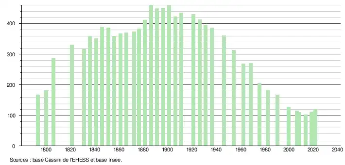 L'évolution du nombre d'habitants est connue à travers les recensements de la population effectués dans la commune depuis 1793. Pour les communes de moins de 10 000 habitants, une enquête de recensement portant sur toute la population est réalisée tous les cinq ans, les populations légales des années intermédiaires étant quant à elles estimées par interpolation ou extrapolation[30]. Pour la commune, le premier recensement exhaustif entrant dans le cadre du nouveau dispositif a été réalisé en 2008[31].