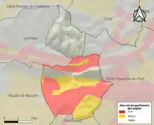 La commune est vulnérable au risque de mouvements de terrains constitué principalement du retrait-gonflement des sols argileux[22]. Cet aléa est susceptible d'engendrer des dommages importants aux bâtiments en cas d’alternance de périodes de sécheresse et de pluie. 61,6 % de la superficie communale est en aléa moyen ou fort (67,5 % au niveau départemental et 48,5 % au niveau national). Sur les 152 bâtiments dénombrés sur la commune en 2019, 133 sont en aléa moyen ou fort, soit 88 %, à comparer aux 90 % au niveau départemental et 54 % au niveau national. Une cartographie de l'exposition du territoire national au retrait gonflement des sols argileux est disponible sur le site du BRGM[23],[Carte 2].