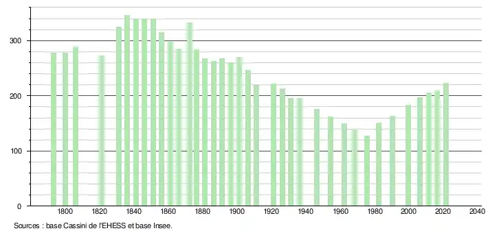 L'évolution du nombre d'habitants est connue à travers les recensements de la population effectués dans la commune depuis 1793. Pour les communes de moins de 10 000 habitants, une enquête de recensement portant sur toute la population est réalisée tous les cinq ans, les populations légales des années intermédiaires étant quant à elles estimées par interpolation ou extrapolation[27]. Pour la commune, le premier recensement exhaustif entrant dans le cadre du nouveau dispositif a été réalisé en 2006[28].