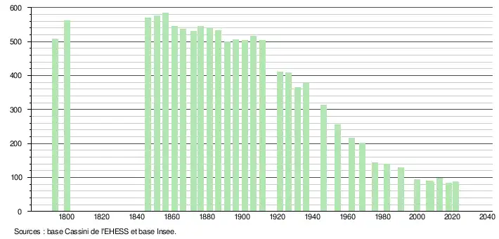 L'évolution du nombre d'habitants est connue à travers les recensements de la population effectués dans la commune depuis 1793. Pour les communes de moins de 10 000 habitants, une enquête de recensement portant sur toute la population est réalisée tous les cinq ans, les populations légales des années intermédiaires étant quant à elles estimées par interpolation ou extrapolation[49]. Pour la commune, le premier recensement exhaustif entrant dans le cadre du nouveau dispositif a été réalisé en 2007[50].