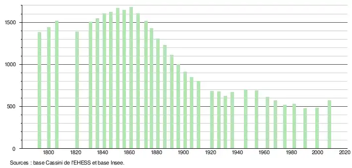 - Dans le tableau des recensements et le graphique, par convention dans Wikipédia, le principe a été retenu, pour les populations légales postérieures à 1999 de n’afficher dans le tableau des recensements et le graphique que les populations correspondant à l'année 2006, première population légale publiée calculée conformément aux concepts définis dans le décret no 2003-485 du 5 juin 2003, et les années correspondant à une enquête exhaustive de recensement pour les communes de moins de 10 000 habitants, ainsi que la dernière population légale publiée par l’Insee.