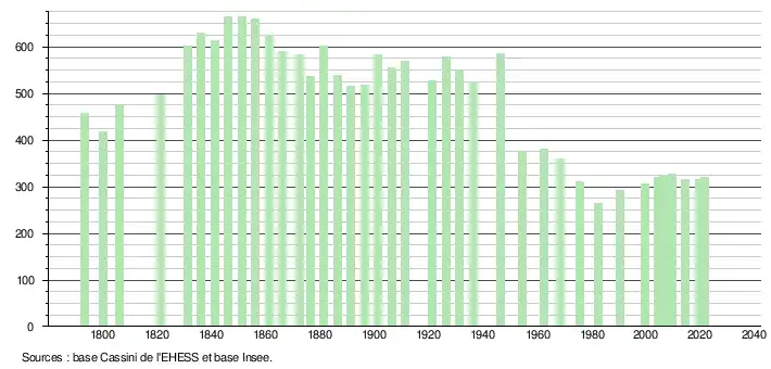 L'évolution du nombre d'habitants est connue à travers les recensements de la population effectués dans la commune depuis 1793. Pour les communes de moins de 10 000 habitants, une enquête de recensement portant sur toute la population est réalisée tous les cinq ans, les populations légales des années intermédiaires étant quant à elles estimées par interpolation ou extrapolation[33]. Pour la commune, le premier recensement exhaustif entrant dans le cadre du nouveau dispositif a été réalisé en 2004[34].