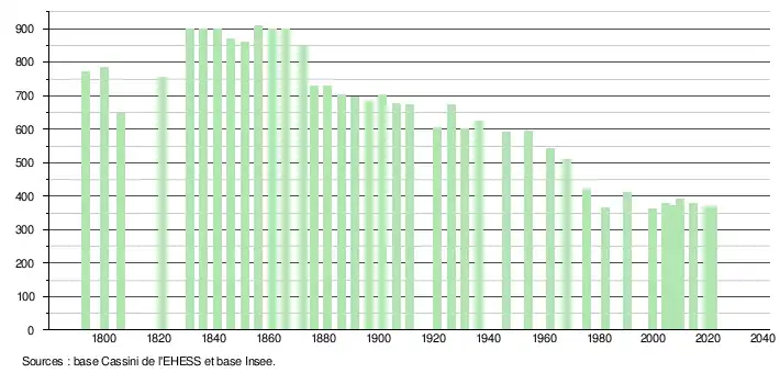 L'évolution du nombre d'habitants est connue à travers les recensements de la population effectués dans la commune depuis 1793. Pour les communes de moins de 10 000 habitants, une enquête de recensement portant sur toute la population est réalisée tous les cinq ans, les populations légales des années intermédiaires étant quant à elles estimées par interpolation ou extrapolation[24]. Pour la commune, le premier recensement exhaustif entrant dans le cadre du nouveau dispositif a été réalisé en 2004[25].