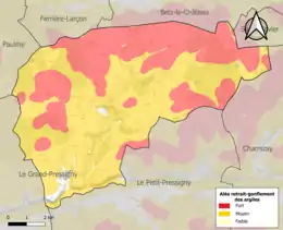 Le retrait-gonflement des sols argileux est susceptible d'engendrer des dommages importants aux bâtiments en cas d’alternance de périodes de sécheresse et de pluie. 98,1 % de la superficie communale est en aléa moyen ou fort (90,2 % au niveau départemental et 48,5 % au niveau national). Sur les 226 bâtiments dénombrés sur la commune en 2019, 200 sont en aléa moyen ou fort, soit 88 %, à comparer aux 91 % au niveau départemental et 54 % au niveau national. Une cartographie de l'exposition du territoire national au retrait gonflement des sols argileux est disponible sur le site du BRGM[22],[23].