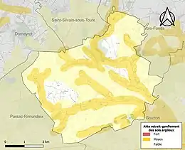 Le retrait-gonflement des sols argileux est susceptible d'engendrer des dommages importants aux bâtiments en cas d’alternance de périodes de sécheresse et de pluie. 42,1 % de la superficie communale est en aléa moyen ou fort (33,6 % au niveau départemental et 48,5 % au niveau national). Sur les 100 bâtiments dénombrés sur la commune en 2019, 16 sont en aléa moyen ou fort, soit 16 %, à comparer aux 25 % au niveau départemental et 54 % au niveau national. Une cartographie de l'exposition du territoire national au retrait gonflement des sols argileux est disponible sur le site du BRGM[25],[Carte 2].