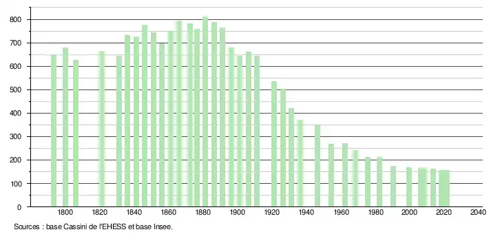 L'évolution du nombre d'habitants est connue à travers les recensements de la population effectués dans la commune depuis 1793. Pour les communes de moins de 10 000 habitants, une enquête de recensement portant sur toute la population est réalisée tous les cinq ans, les populations légales des années intermédiaires étant quant à elles estimées par interpolation ou extrapolation[29]. Pour la commune, le premier recensement exhaustif entrant dans le cadre du nouveau dispositif a été réalisé en 2008[30].
