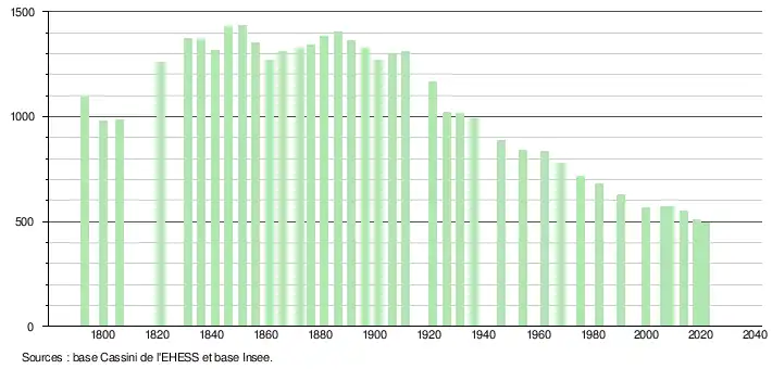 L'évolution du nombre d'habitants est connue à travers les recensements de la population effectués dans la commune depuis 1793. Pour les communes de moins de 10 000 habitants, une enquête de recensement portant sur toute la population est réalisée tous les cinq ans, les populations légales des années intermédiaires étant quant à elles estimées par interpolation ou extrapolation[31]. Pour la commune, le premier recensement exhaustif entrant dans le cadre du nouveau dispositif a été réalisé en 2008[32].